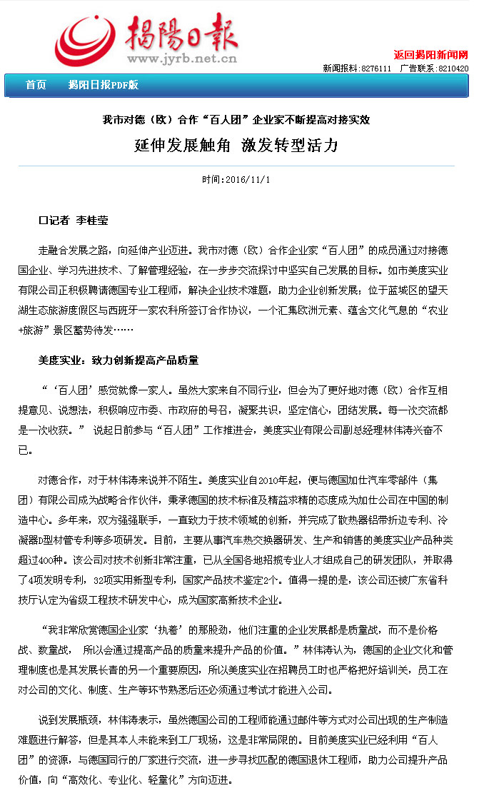 走融合發(fā)展之路,向延伸產(chǎn)業(yè)邁進(jìn)。我市對(duì)德(歐)合作企業(yè)家“百人團(tuán)”的成員通過(guò)對(duì)接德國(guó)企業(yè)、學(xué)習(xí)先進(jìn)技術(shù)、了解管理經(jīng)驗(yàn),在一步步交流探討中堅(jiān)實(shí)自己發(fā)展的目標(biāo)。如市美度實(shí)業(yè)有限公司正積極聘請(qǐng)德國(guó)專業(yè)工程師,解決企業(yè)技術(shù)難題,助力企業(yè)創(chuàng)新發(fā)展。