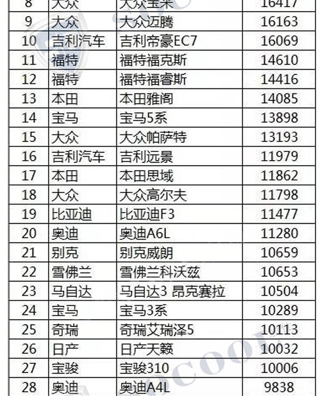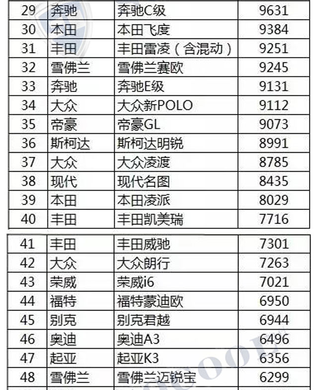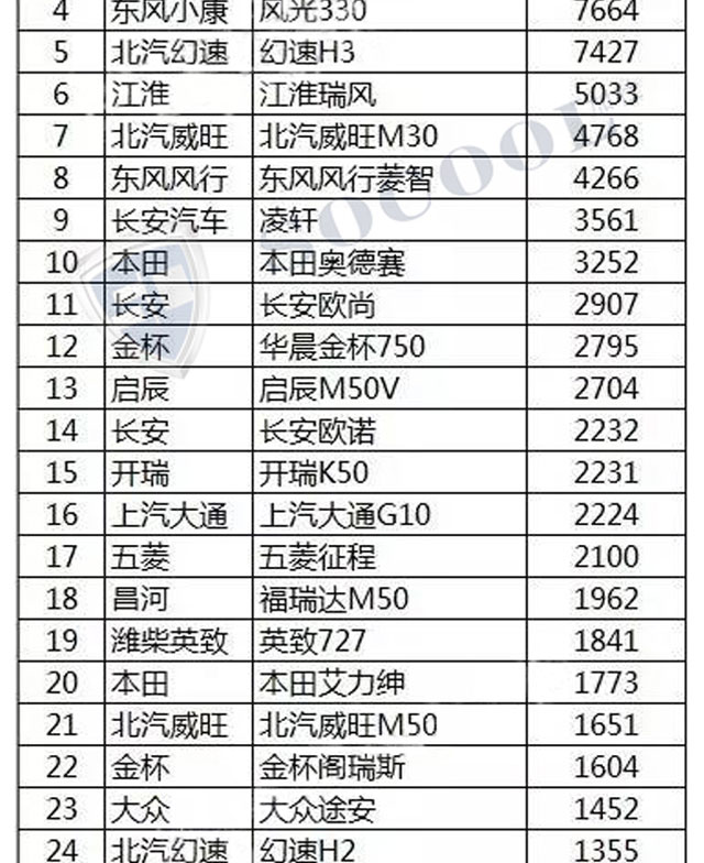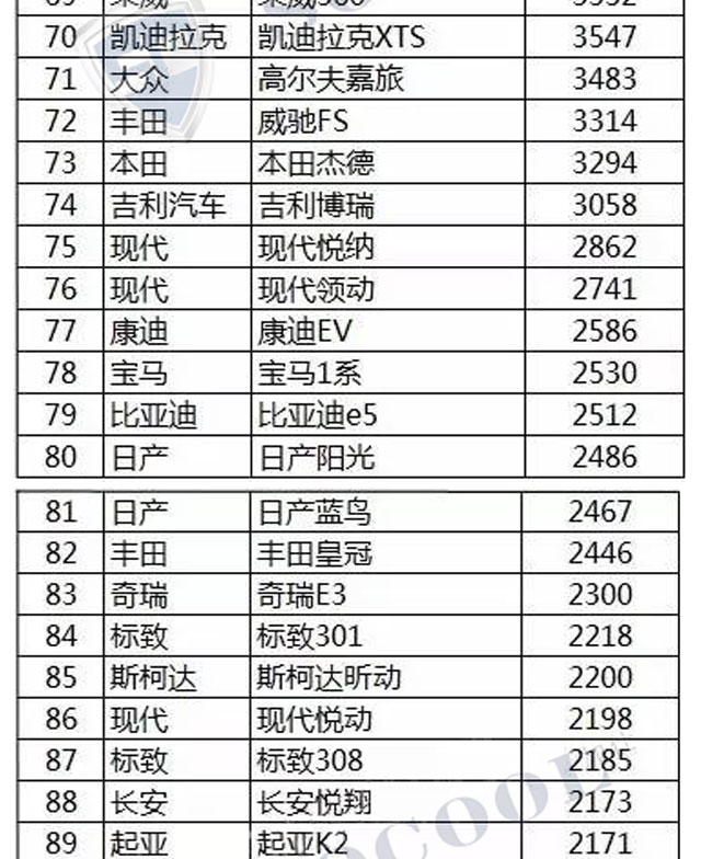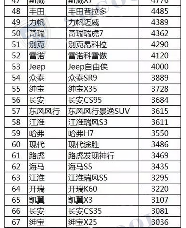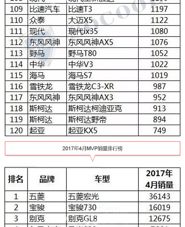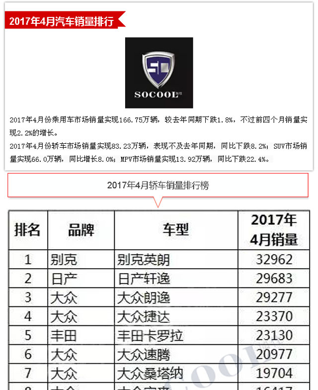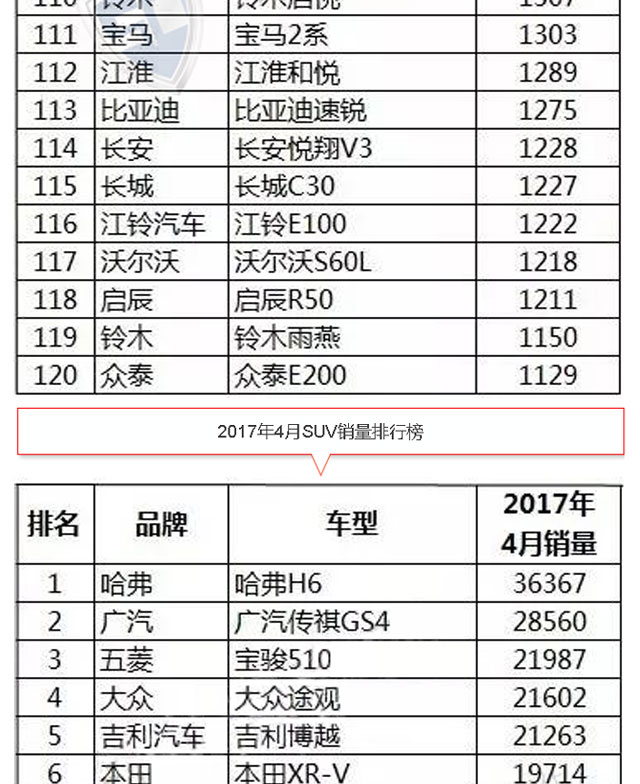 【銷量排行】2017年4月汽車銷量排行榜