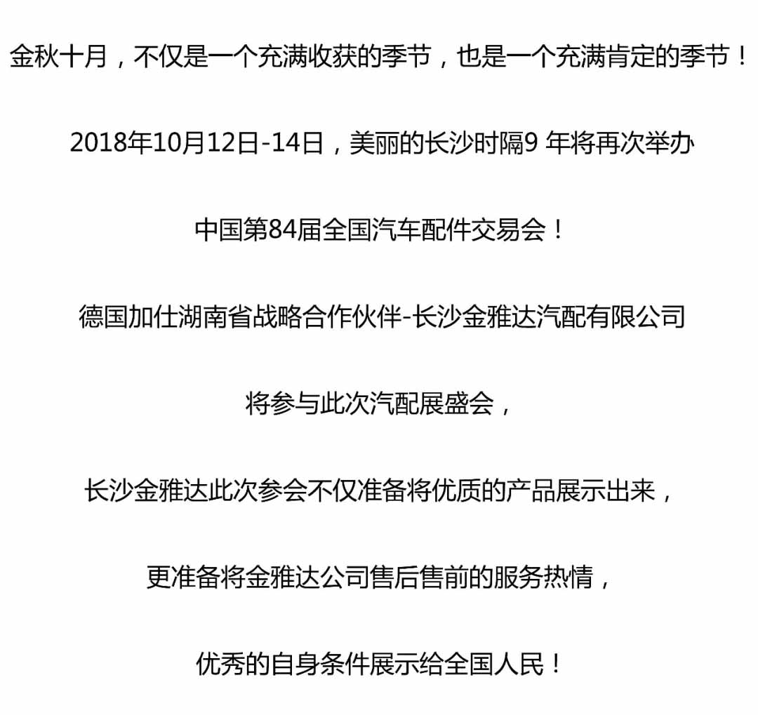 德國(guó)加仕湖南戰(zhàn)略合作伙伴長(zhǎng)沙金雅達(dá)汽配參與第84屆全國(guó)汽配展
